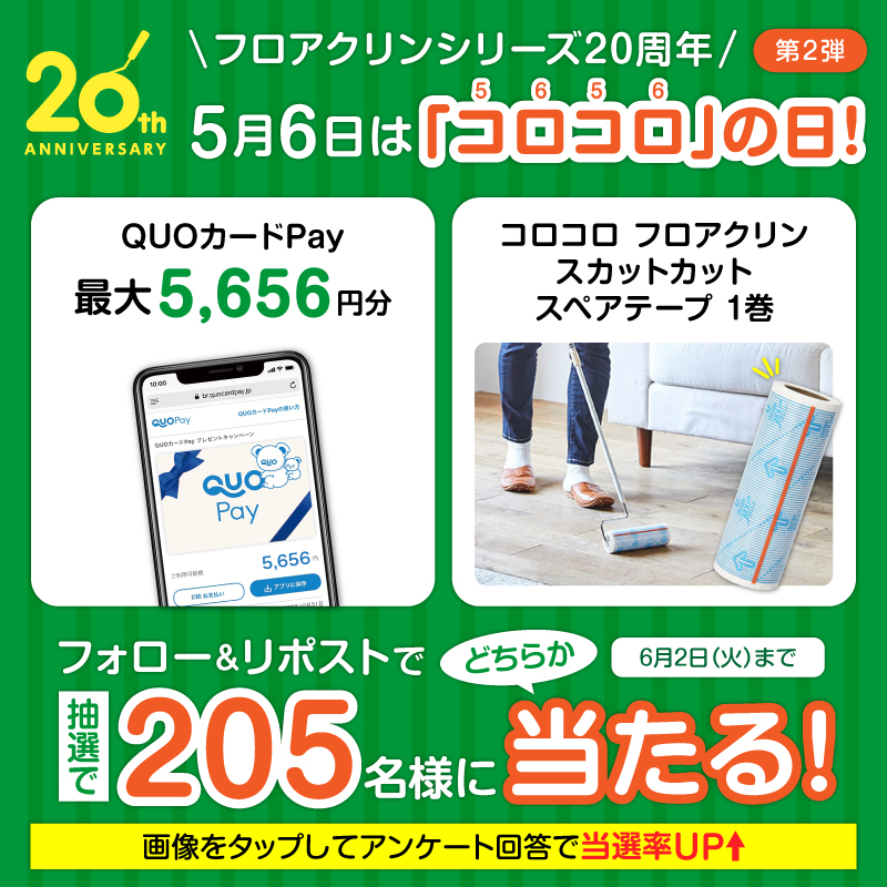 フォロー&リポストで、QUOカードPayが5,656円分、または「コロコロ フロアクリン スカットカット」のスペアテープ1巻が当たる!